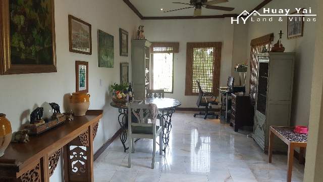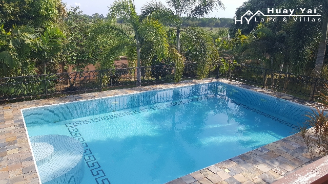 Quality construction in 2008 – the character villa is set in a large garden plot with the benefit of the living accommodation being raised to catch the through breeze with double doors front and back affording excellent air flow. Marble floors internally make the house feel airy and cool & classy. To the rear of the house is a large part covered terrace which benefits from excellent views over adjoining low lying farmland. The character of the house is further enhanced with the use of decorative wood throughout the living area and also terracotta flooring to the terraces to the front and rear. A small staircase drops from the rear raised terrace to the raised swimming pool. Set in a quiet and desirable location with mature and modern farang neighbours with easy access to the Huay Yai Road, it is in a quiet neighbourhood and yet adjoining open countryside