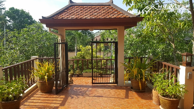 Raised stand alone character villa of 375sqm with excellent views over adjoining open farmland rice fields to hills in the distance. Lovely. Set in a mature walled plot of 1 Rai 189tw ( 2356sqm) – mostly laid to lawn with drive and parking to under cover extensive storage / parking and staff accommodation.