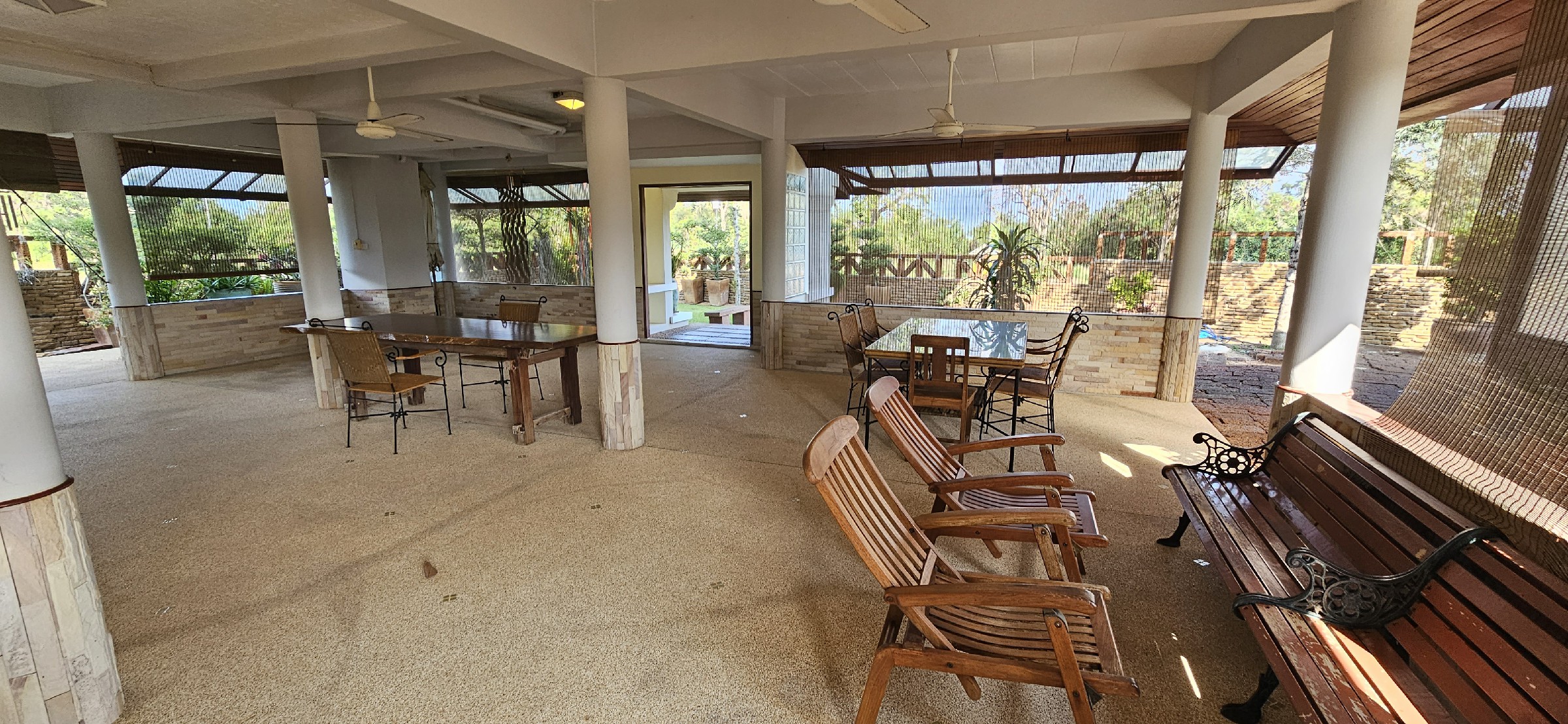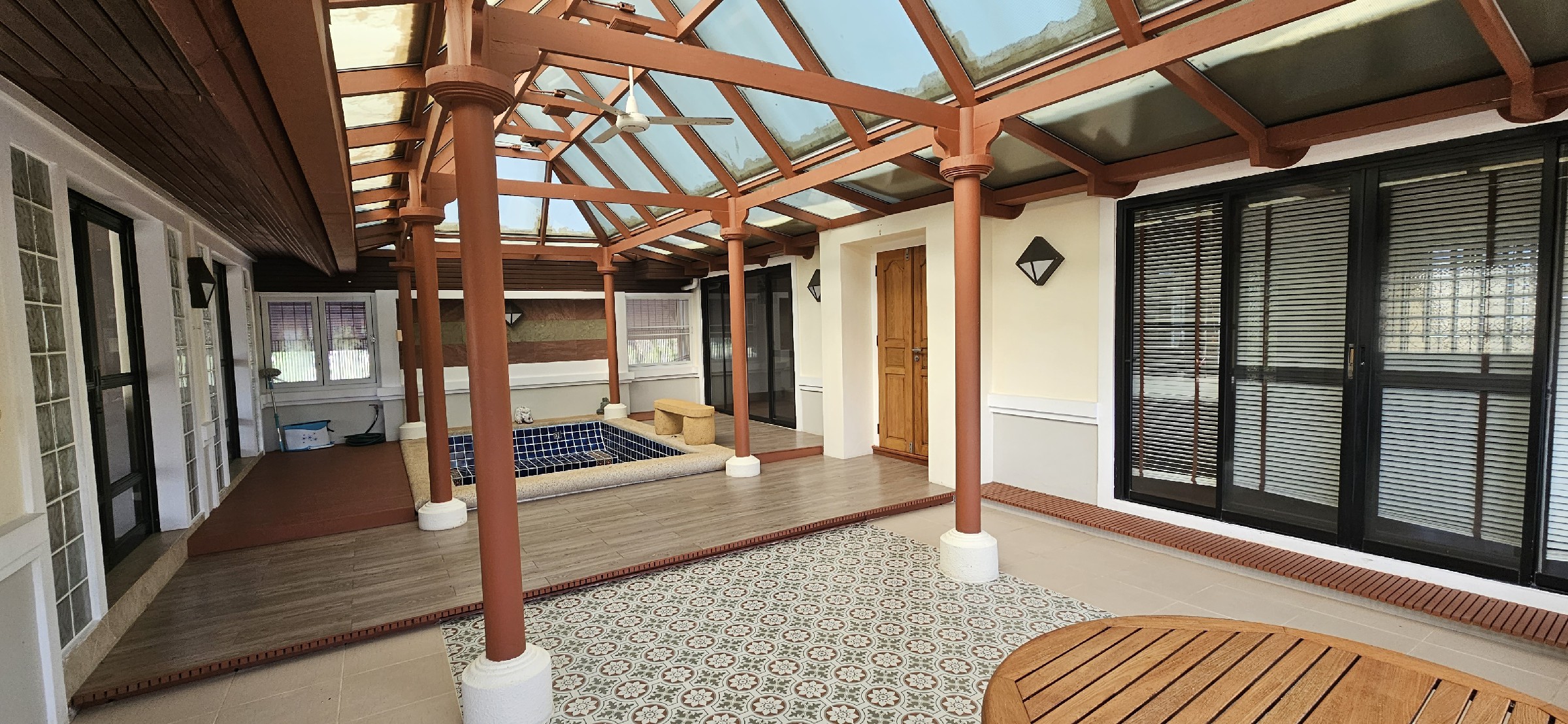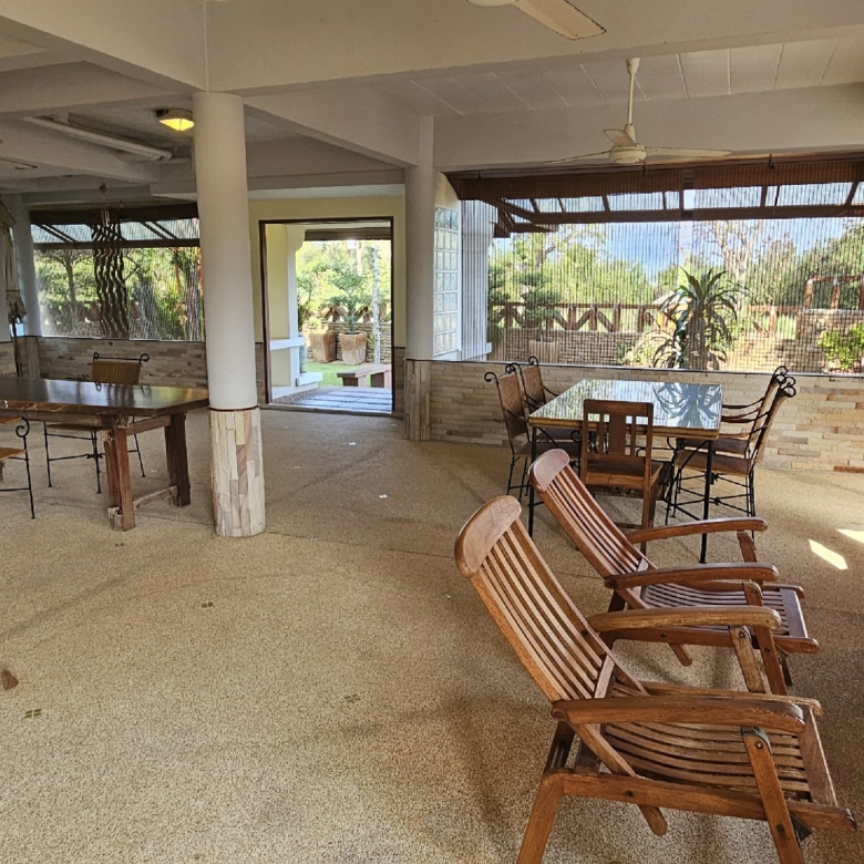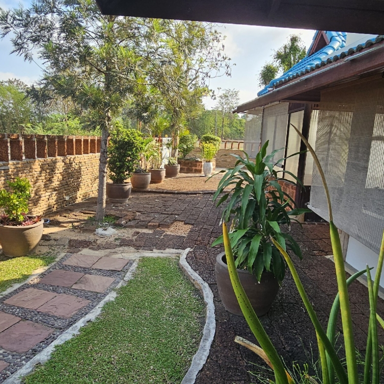 This interesting older 2 storey house is beautifully presented and set on a back plot beside the fairway. The spacious house is thought to have been built in 2002. Downstairs is mostly open with maids room, 2 store rooms and guest bathroom and a room with a kitchen. There is space for parking of 2 cars and beside this an airy spacious area for recreation, dining or possible conversion into extra bedrooms. An enclosed staircase to the second floor opens into a large covered landing area with a large sunken bath / fish pond and vaulted ceiling. Of this room to one side is a Sitting Room looking over the fairway and to the other side 2 bedrooms both with en-suite bathrooms. Outside is a small detached room, currently housing a motorbike